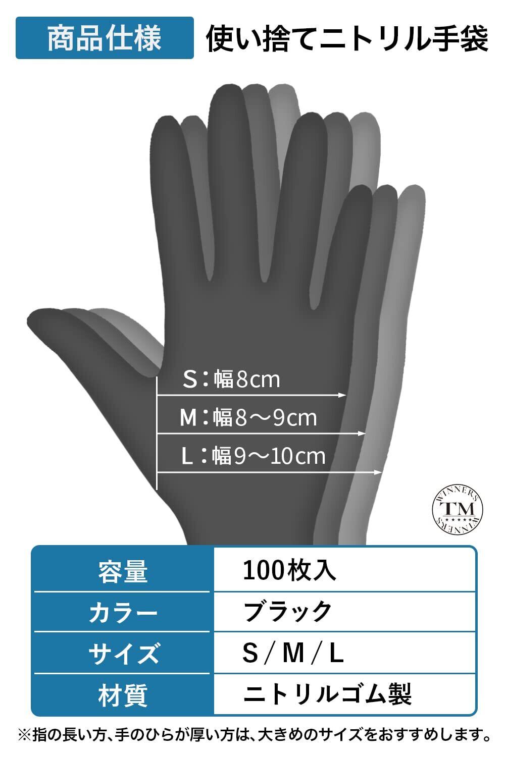 [Tmwinners] ゴム手袋 使い捨て (スマホ対応可) 100枚入り ブラック 左右兼用 【SML】